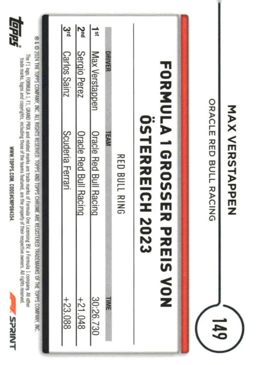 2024 Topps Chrome Formula 1 #149 Max Verstappen NM-MT Oracle Red Bull Racing Racing Card