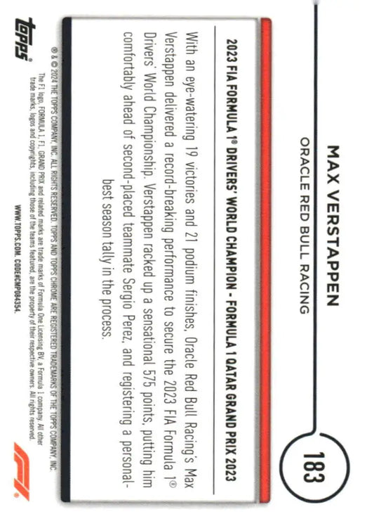 2024 Topps Chrome Formula 1 #183 Max Verstappen NM-MT Oracle Red Bull Racing Racing Card