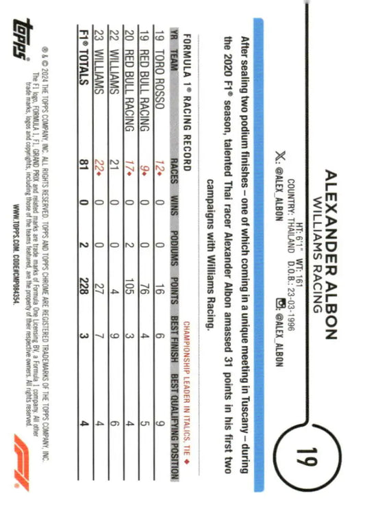 2024 Topps Chrome Formula 1 #19 Alexander Albon NM-MT Williams Racing Racing Card