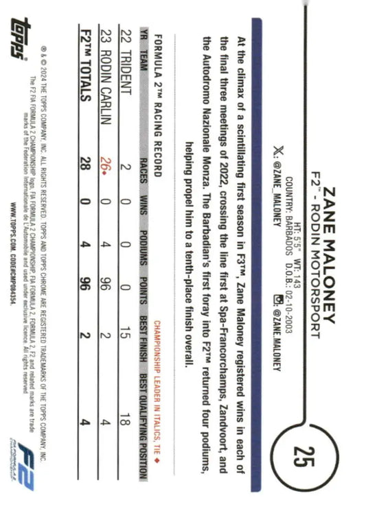 2024 Topps Chrome Formula 1 #25 Zane Maloney NM-MT F2 - Rodin Motorsport Racing Card
