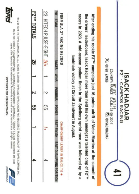 2024 Topps Chrome Formula 1 #41 Isack Hadjar NM-MT F2 - Campos Racing Racing Card