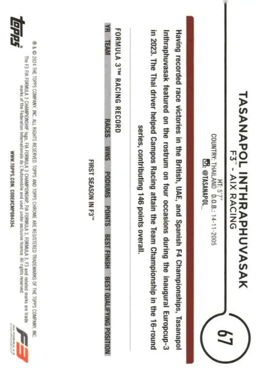 2024 Topps Chrome Formula 1 #67 Tasanapol Inthraphuvasak NM-MT F3 - AIX Racing Racing Card