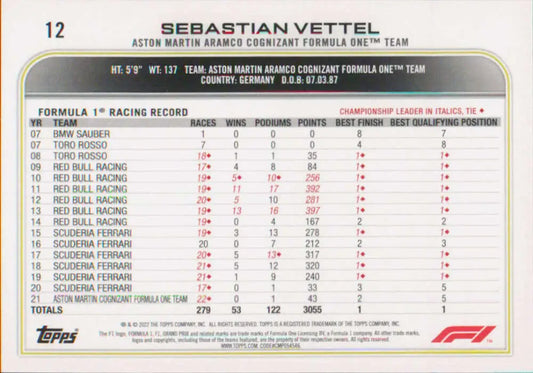 2022 Topps Formula 1 #12 Sebastian Vettel NM-MT Racing Card