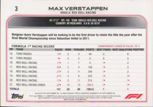 2022 Topps Formula 1 #3 Max Verstappen NM-MT Racing Card
