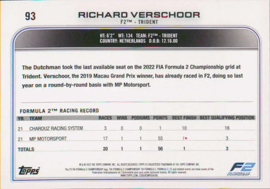2022 Topps Formula 1 #93 Richard Verschoor NM-MT Racing Card