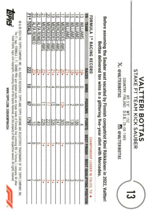 2024 Topps Chrome Formula 1 #13 Valtteri Bottas NM-MT Stake F1 Team KICK Sauber Racing Card