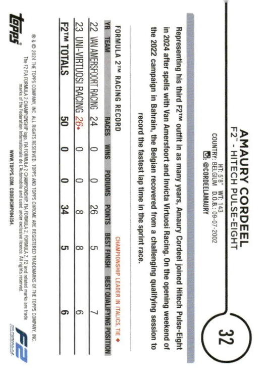 2024 Topps Chrome Formula 1 #32 Amaury Cordeel NM-MT F2 - Hitech Pulse-Eight Racing Card