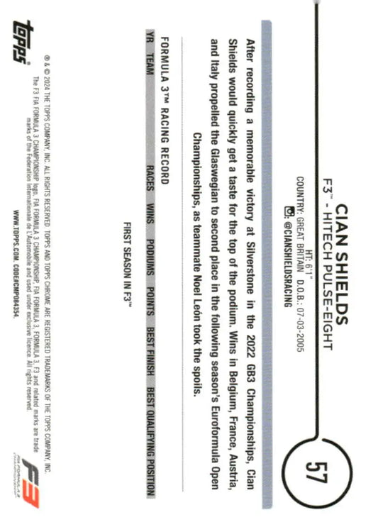 2024 Topps Chrome Formula 1 #57 Cian Shields NM-MT F3 - Hitech Pulse-Eight Racing Card