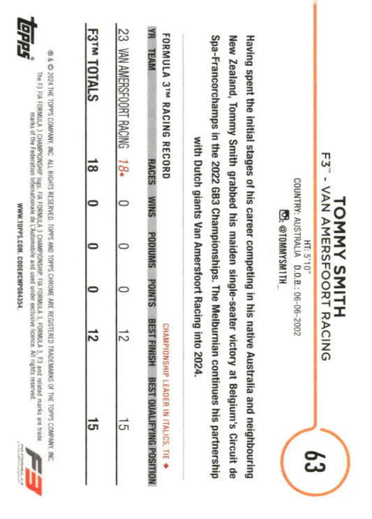 2024 Topps Chrome Formula 1 #63 Tommy Smith NM-MT F3 - Van Amersfoort Racing Racing Card