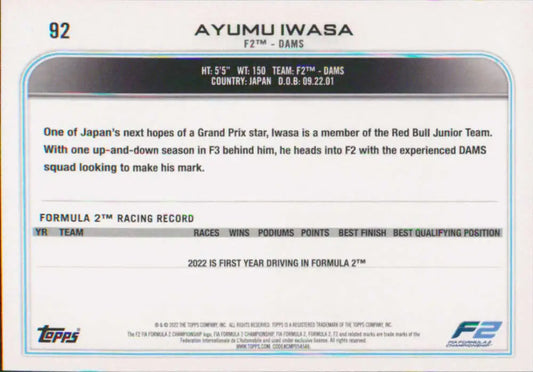 2022 Topps Formula 1 #92 Ayumu Iwasa NM-MT Racing Card