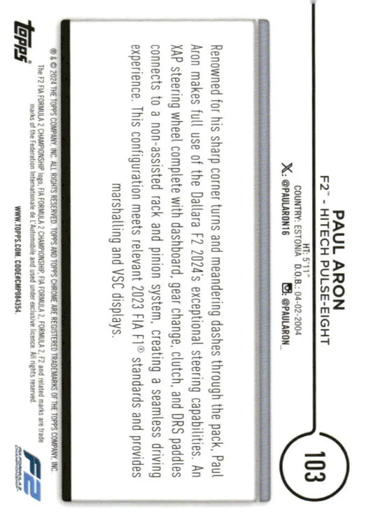 2024 Topps Chrome Formula 1 #103 Paul Aron NM-MT F2 - Hitech Pulse-Eight Racing Card