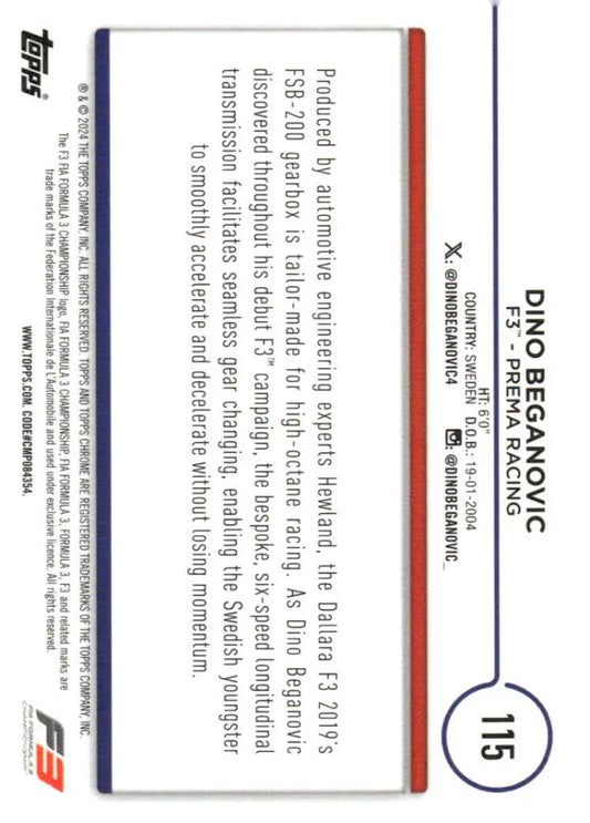2024 Topps Chrome Formula 1 #115 Dino Beganovic NM-MT F3 - PREMA Racing Racing Card