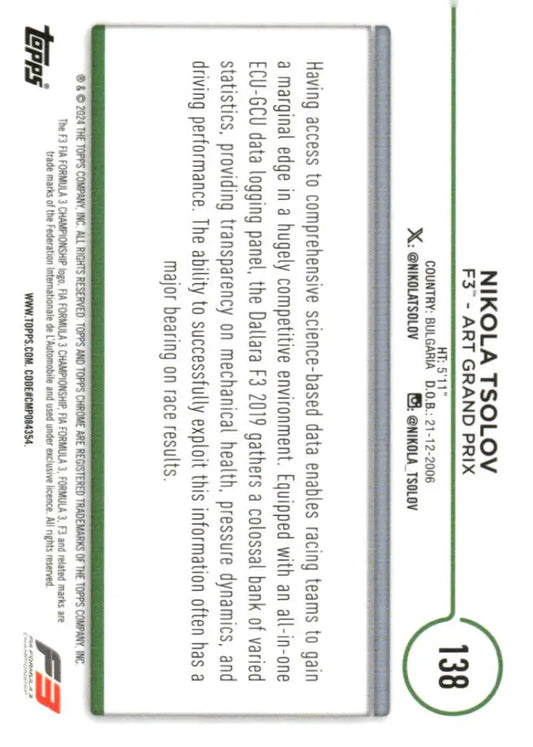 2024 Topps Chrome Formula 1 #138 Nikola Tsolov NM-MT F3 - ART Grand Prix Racing Card