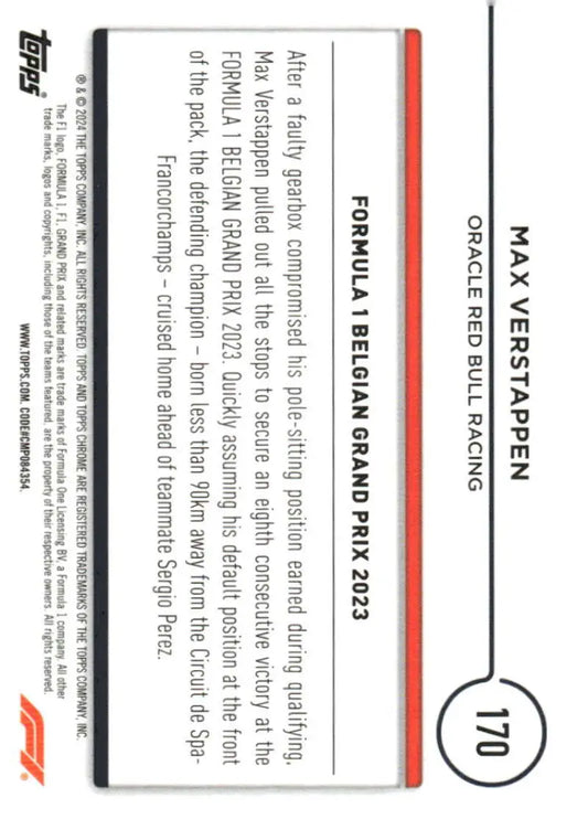 2024 Topps Chrome Formula 1 #170 Max Verstappen NM-MT Oracle Red Bull Racing Racing Card