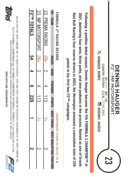 2024 Topps Chrome Formula 1 #23 Dennis Hauger NM-MT F2 - MP Motorsport Racing Card