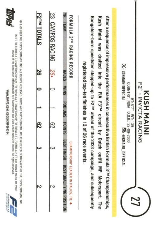 2024 Topps Chrome Formula 1 #27 Kush Maini NM-MT F2 - Invicta Racing Racing Card