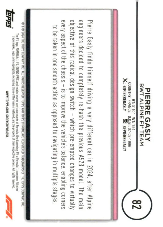 2024 Topps Chrome Formula 1 #82 Pierre Gasly NM-MT BWT Alpine F1 Team Racing Card