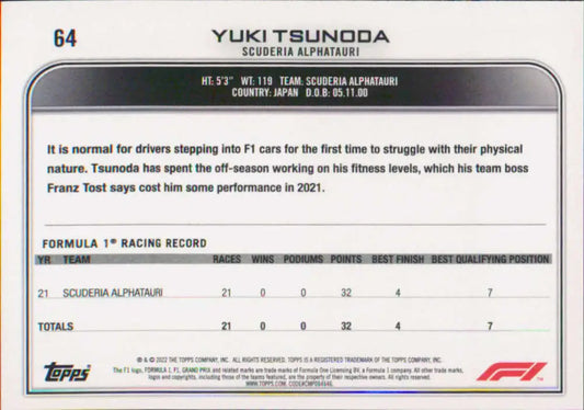 2022 Topps Formula 1 #64 Yuki Tsunoda NM-MT Racing Card