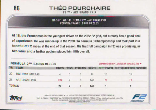 2022 Topps Formula 1 #86 Theo Pourchaire NM-MT Racing Card