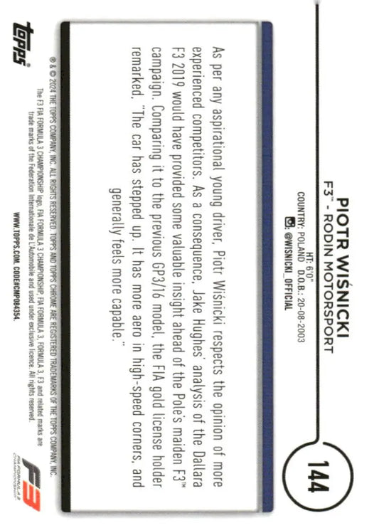 2024 Topps Chrome Formula 1 #144 Piotr Wisnicki NM-MT F3 - Rodin Motorsport Racing Card