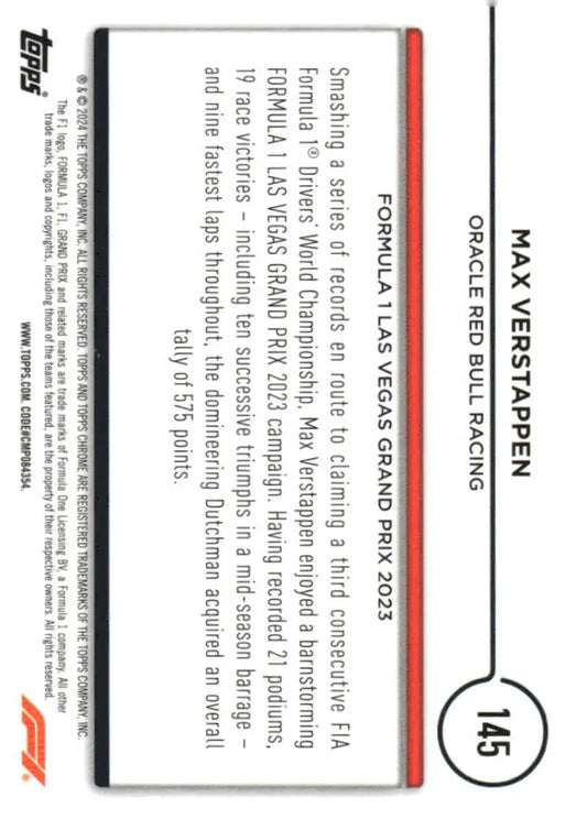 2024 Topps Chrome Formula 1 #145 Max Verstappen NM-MT Oracle Red Bull Racing Racing Card