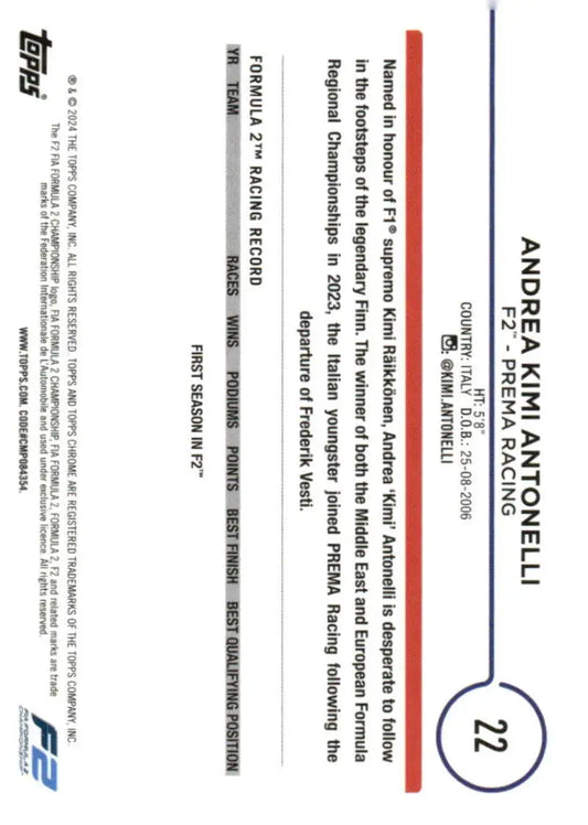 2024 Topps Chrome Formula 1 #22 Andrea Kimi Antonelli NM-MT F2 - PREMA Racing Racing Card