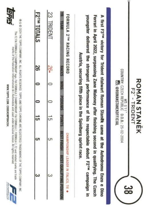 2024 Topps Chrome Formula 1 #38 Roman Stanek NM-MT F2 - Trident Racing Card