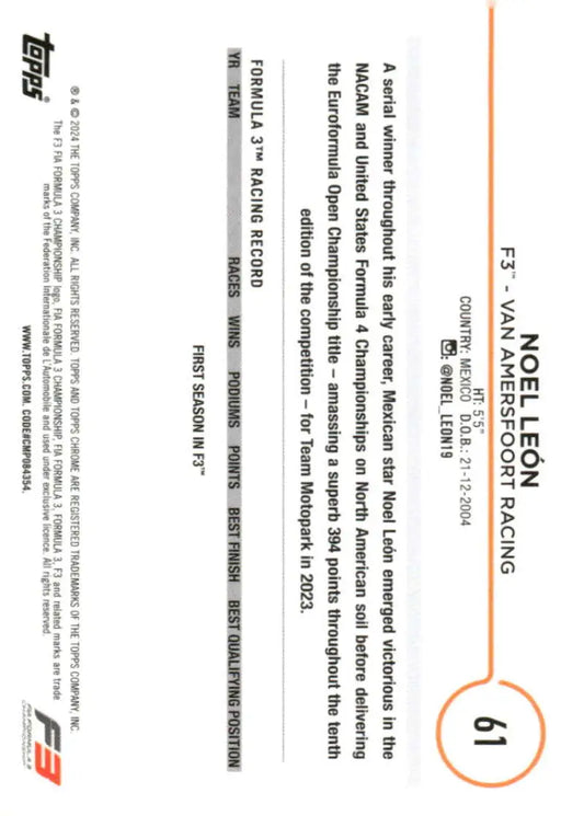 2024 Topps Chrome Formula 1 #61 Noel Leon NM-MT F3 - Van Amersfoort Racing Racing Card