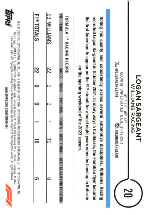 2024 Topps Chrome Formula 1 #20 Logan Sargeant NM-MT Williams Racing Racing Card