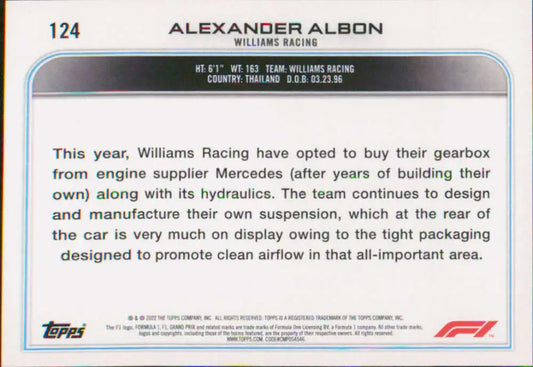 2022 Topps Formula 1 #124 Alexander Albon NM-MT Racing Card