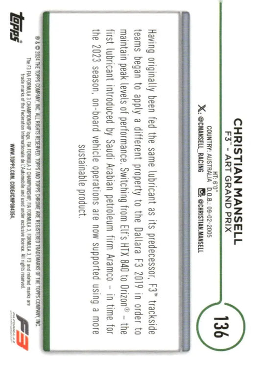 2024 Topps Chrome Formula 1 #136 Christian Mansell NM-MT F3 - ART Grand Prix Racing Card