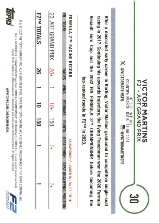 2024 Topps Chrome Formula 1 #30 Victor Martins NM-MT F2 - ART Grand Prix Racing Card