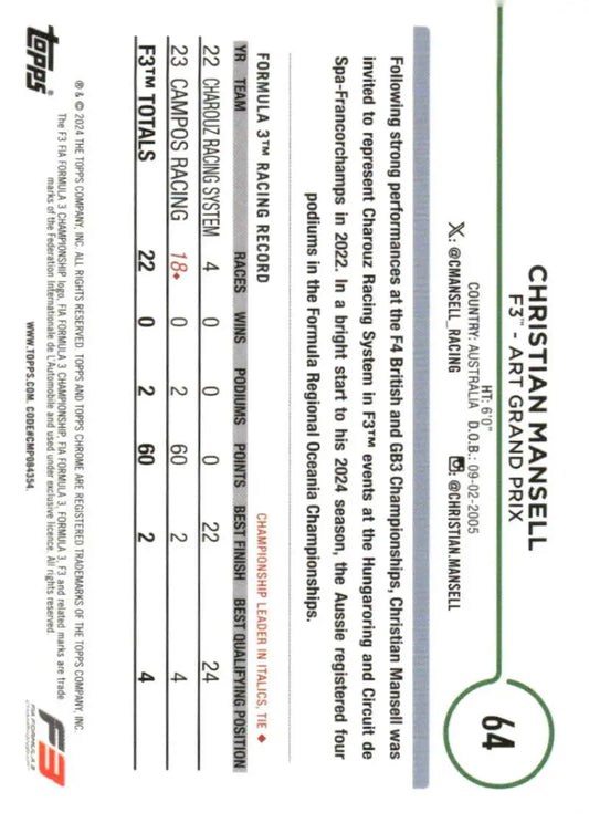 2024 Topps Chrome Formula 1 #64 Christian Mansell NM-MT F3 - ART Grand Prix Racing Card