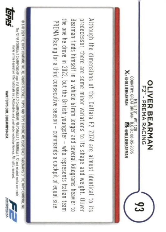 2024 Topps Chrome Formula 1 #93 Oliver Bearman NM-MT F2 - PREMA Racing Racing Card