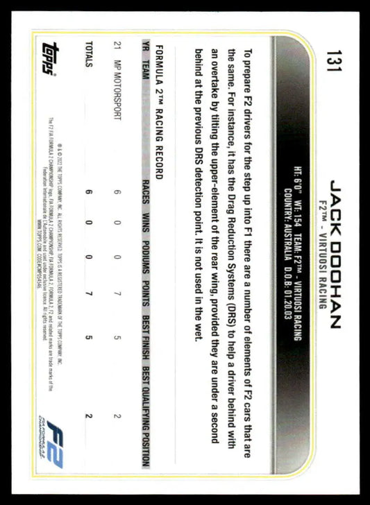 2022 Topps Formula 1 Checker Flag #131 Jack Doohan NM-MT Racing Card