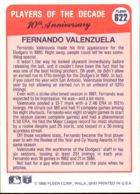 1990 Fleer #622 Fernando Valenzuela 1981 NM-MT Los Angeles Dodgers Baseball Card