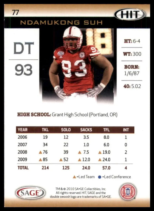 2010 SAGE Hit Ndamukong Suh #77 Rookie Nebraska Cornhuskers Football Card NFL