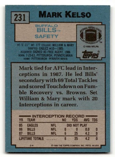 1988 Topps #231 Mark Kelso Buffalo Bills Football Cards EX/NM ID:62564