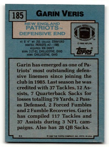 1988 Topps #185 Garin Veris New England Patriots Football Cards EX/N ID:62519