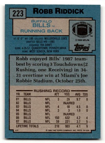 1988 Topps #223 Robb Riddick Buffalo Bills Football Cards EX/NM ID:62555
