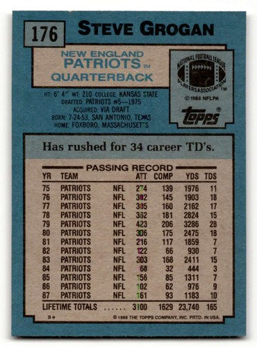 1988 Topps #176 Steve Grogan New England Patriots Football Cards EX/ ID:62510