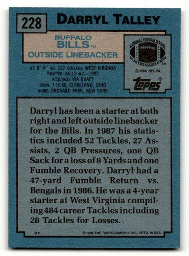 1988 Topps #228 Darryl Talley Buffalo Bills Football Cards EX/NM ID:62560