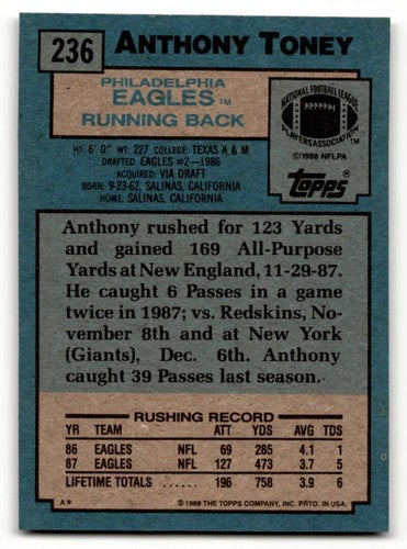 1988 Topps #236 Anthony Toney Philadelphia Eagles Football Cards EX/ ID:62569