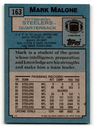 1988 Topps #163 Mark Malone Pittsburgh Steelers Football Cards EX/NM ID:62497