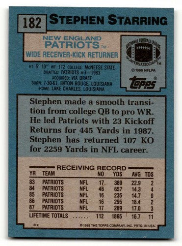 1988 Topps #182 Stephen Starring New England Patriots Football Cards ID:62516