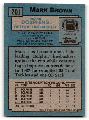1988 Topps #201 Mark Brown Miami Dolphins Football Cards EX/NM ID:62535