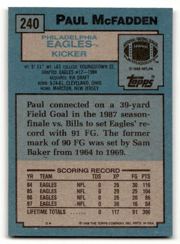 1988 Topps #240 Paul McFadden Philadelphia Eagles Football Cards EX/ ID:62573