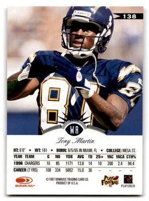 1997 Leaf Football Tony Martin #138 San Diego Chargers