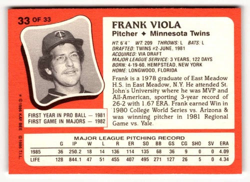 1986 Topps Kay-Bee Young Superstars of Baseball #33 Frank Viola NrMt-Mt ID:50399