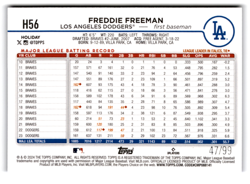 2024 Topps Holiday Purple Metallic Holiday Treen #H56 Freddie Freeman N ID:77331